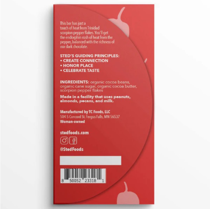 .5 oz. Ingredients: Organic cocoa beans, organic cane sugar, organic cocoa butter, scorpion pepper. Free from soy, gluten and palm oil. Fair Trade. USDA organic.